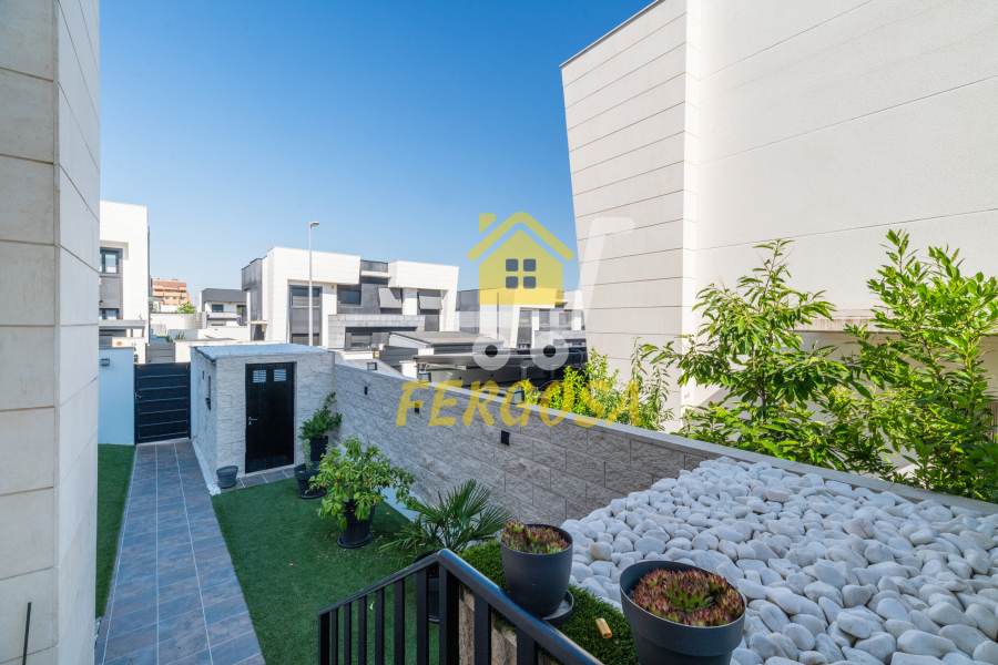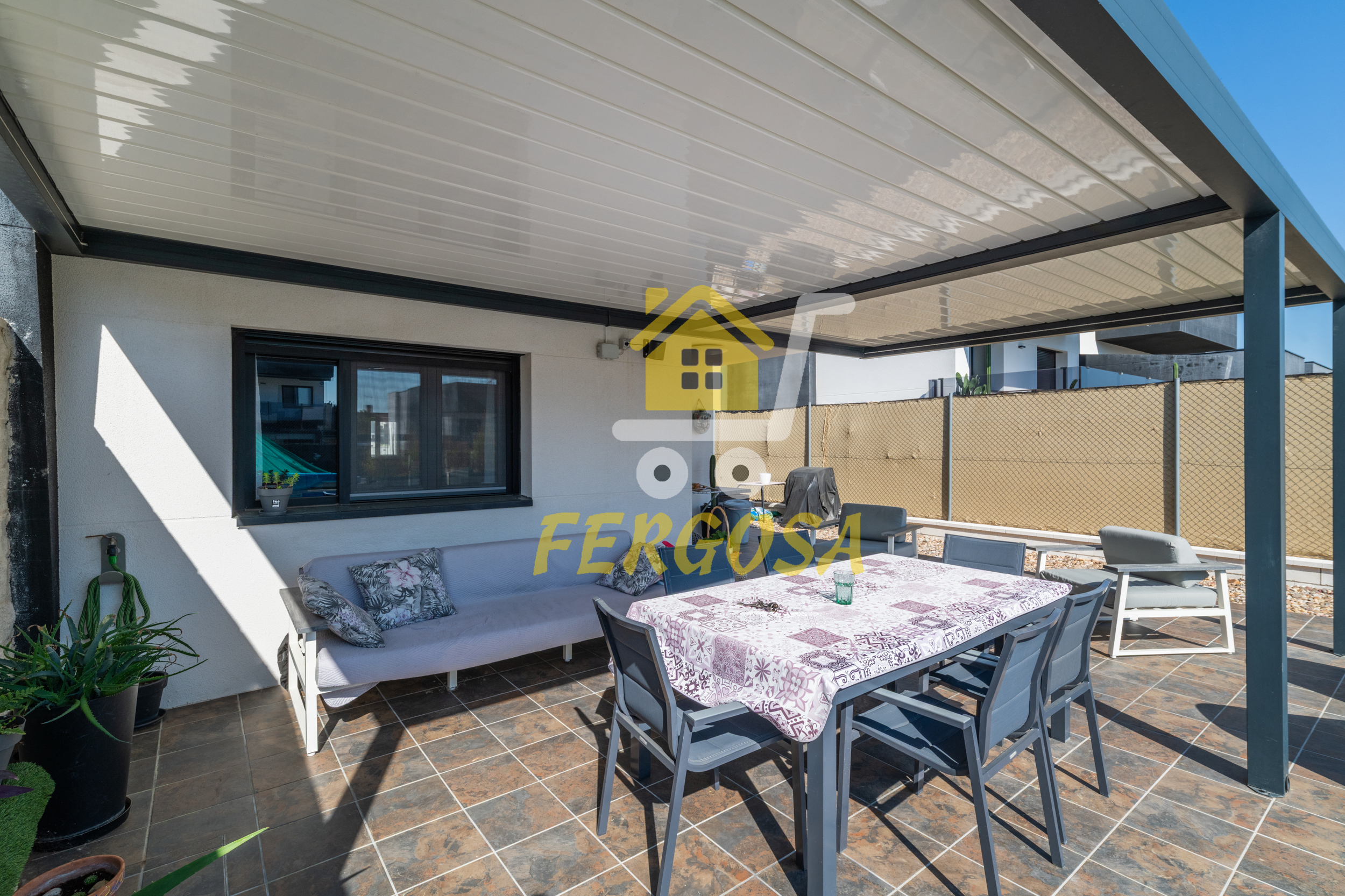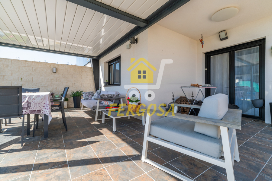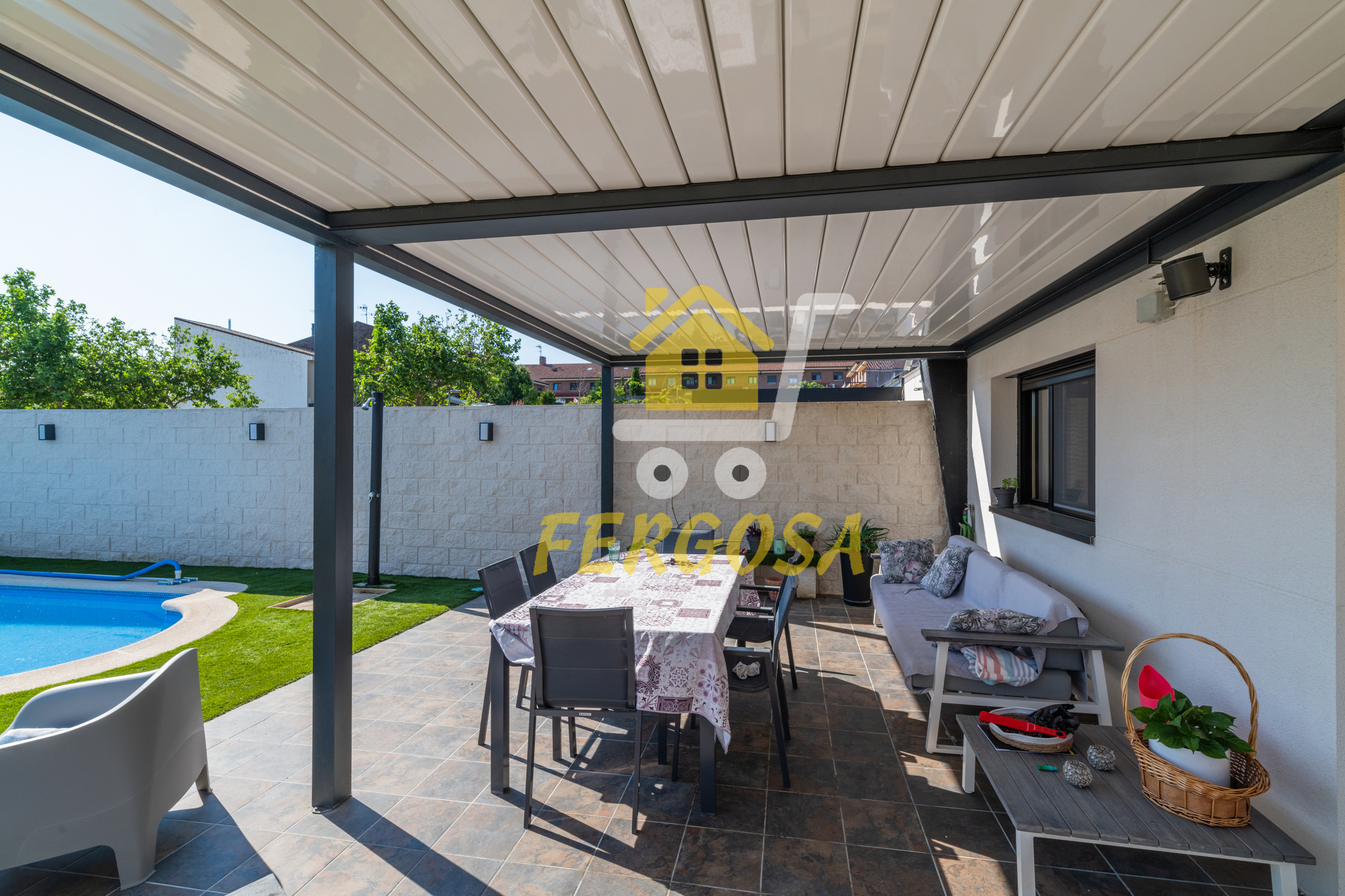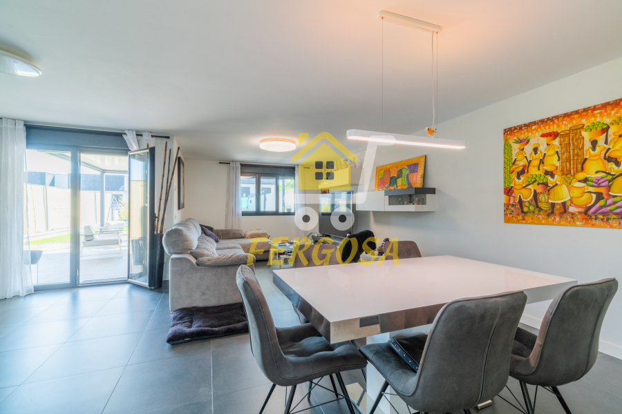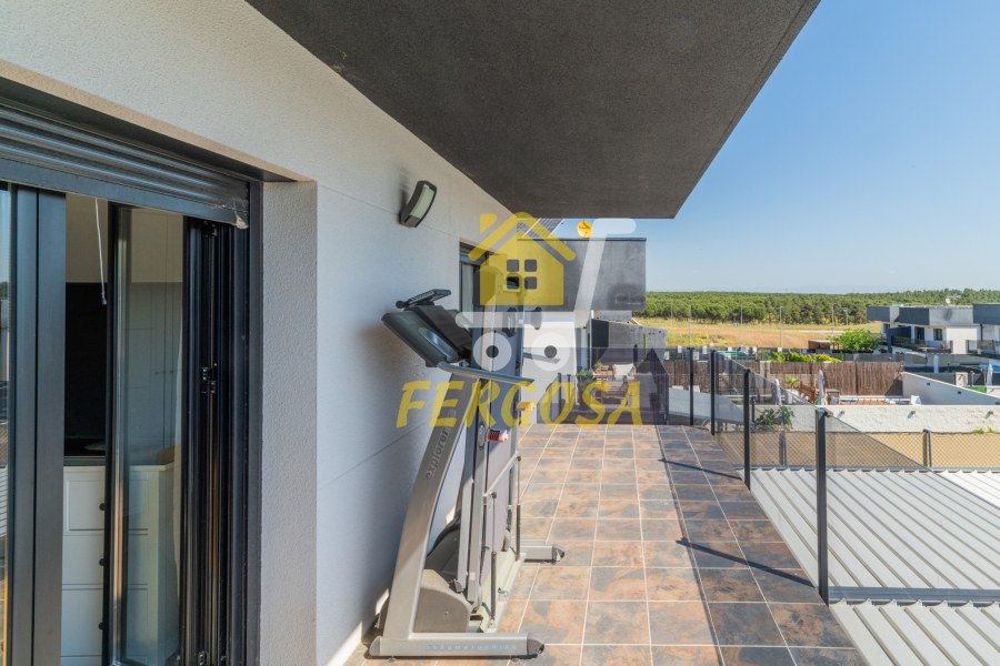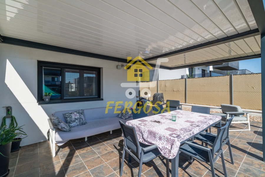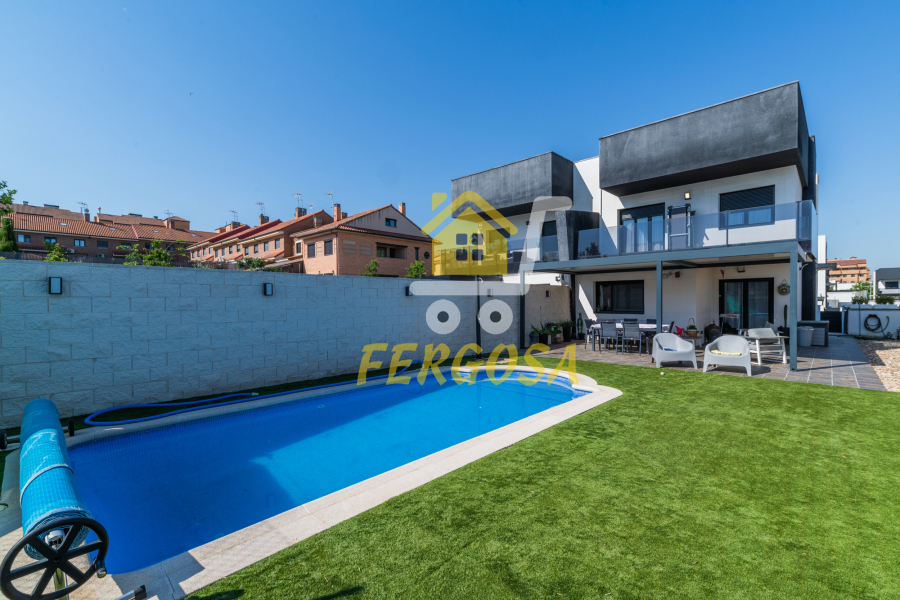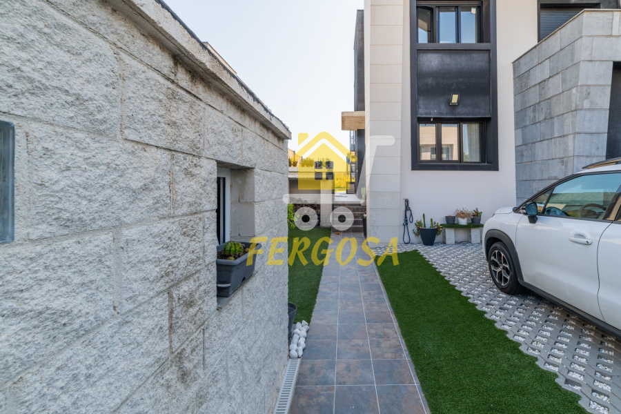 Al entrar en la vivienda nos recibe una zona ajardinada cuidadosamente diseñada, en el lado derecho nada mas entrar tenemos la zona de parking de vehículos, si seguimos el sendero de baldosas nos recibe una leñera y subiendo unos peldaños nos encontramos con la entrada a la vivienda. Al fondo nos encontramos con una fantástica piscina de agua salada para el disfrute de toda la familia sin tener que echar de menos el mar, también tenemos un solárium bioclimático que hará que el sol no sea un impedimento para tus días de piscina.