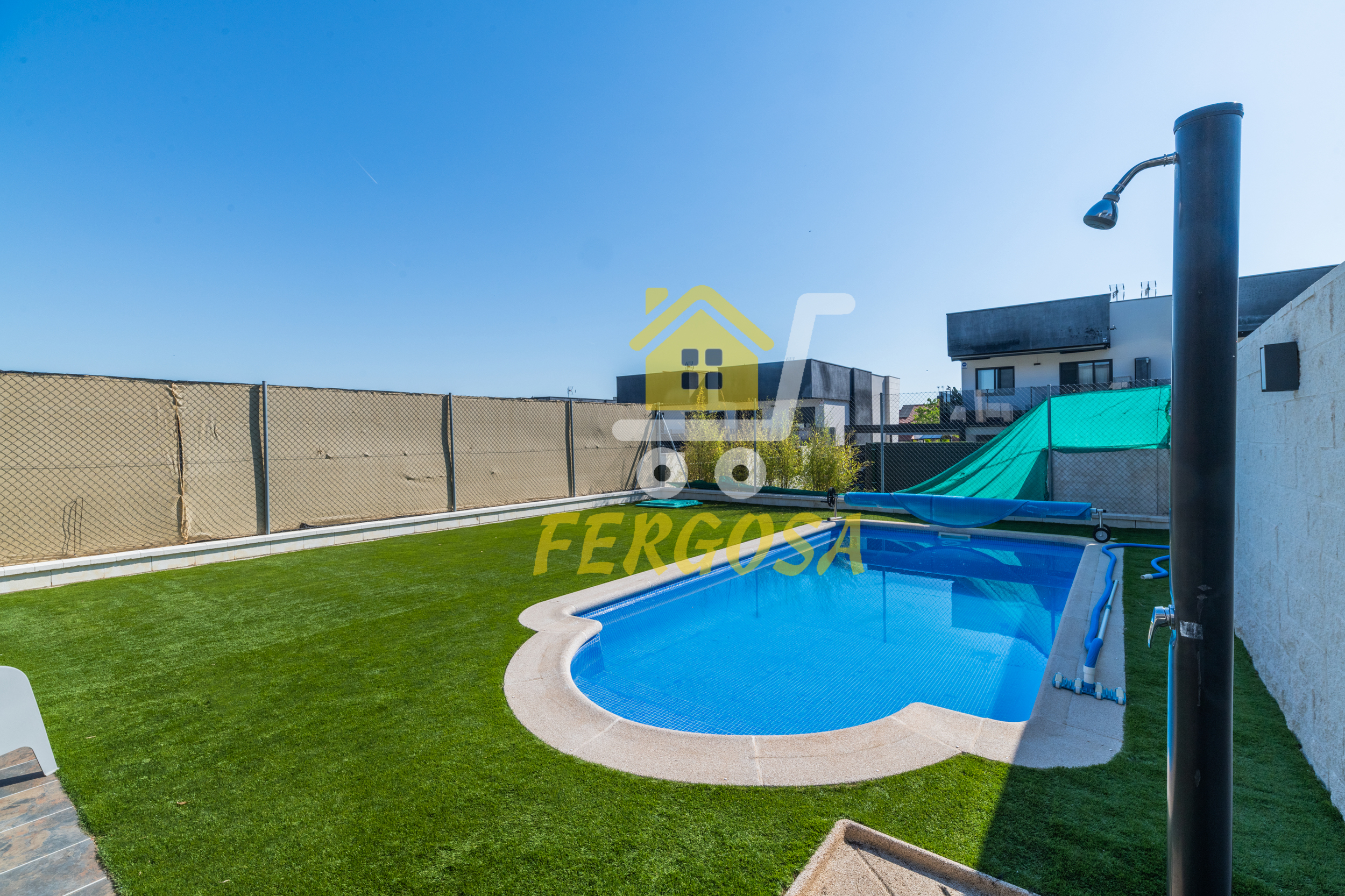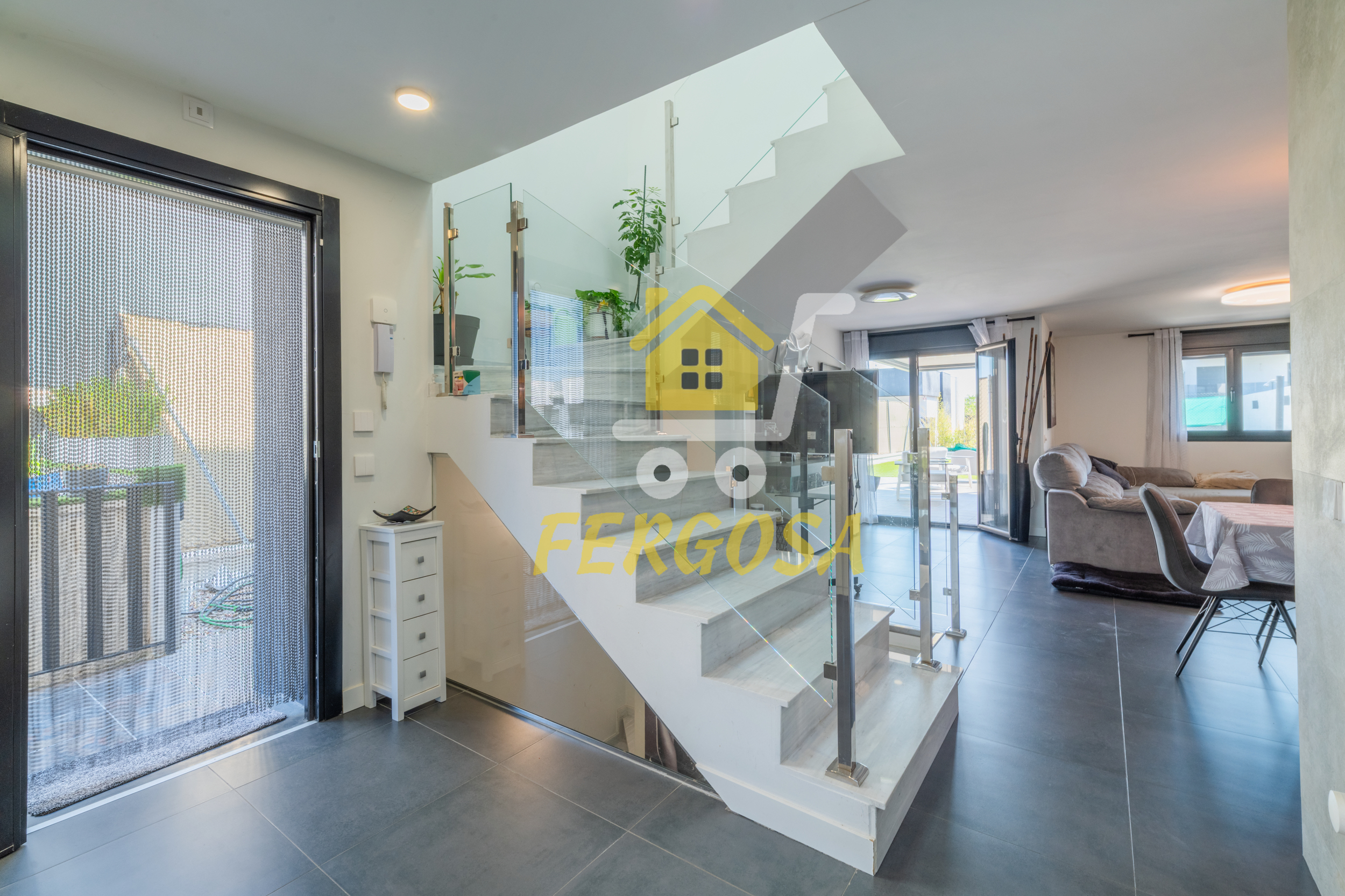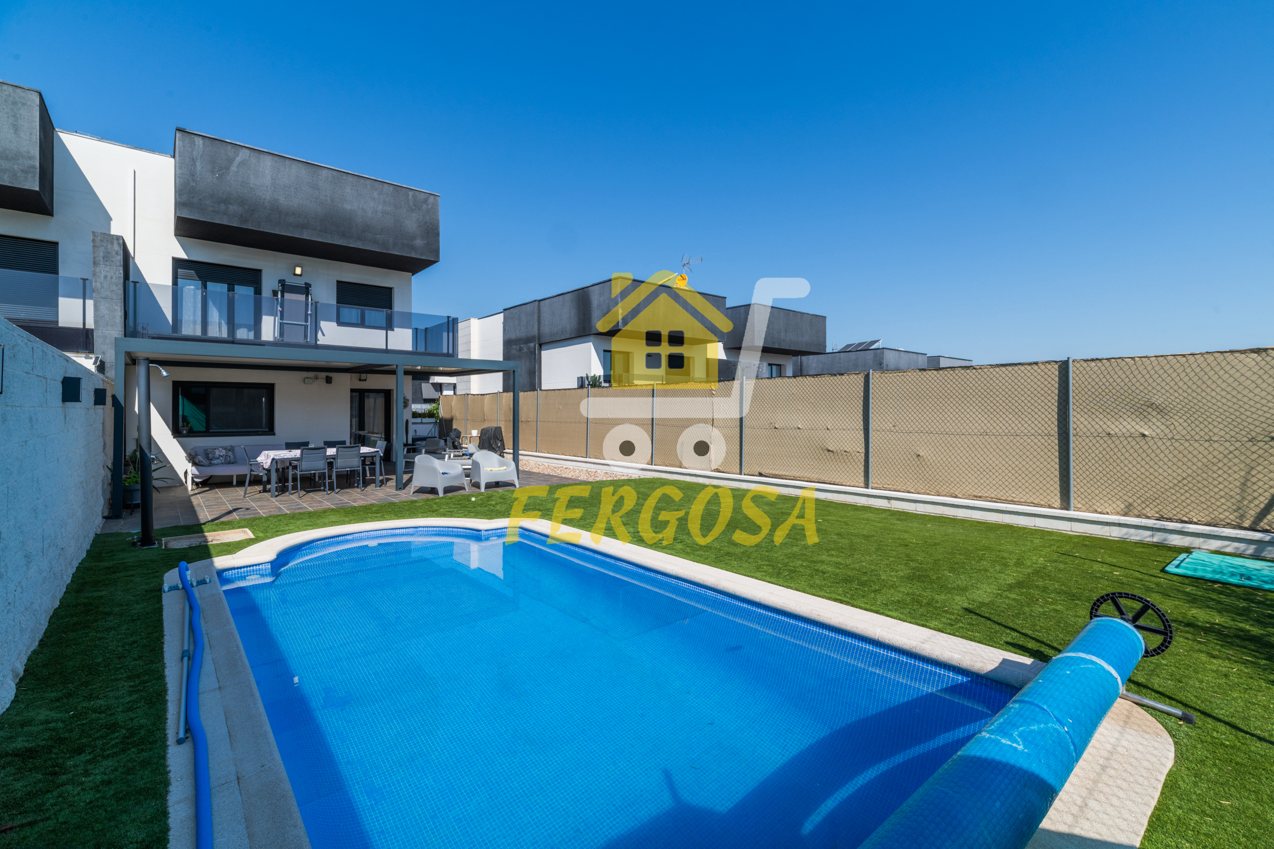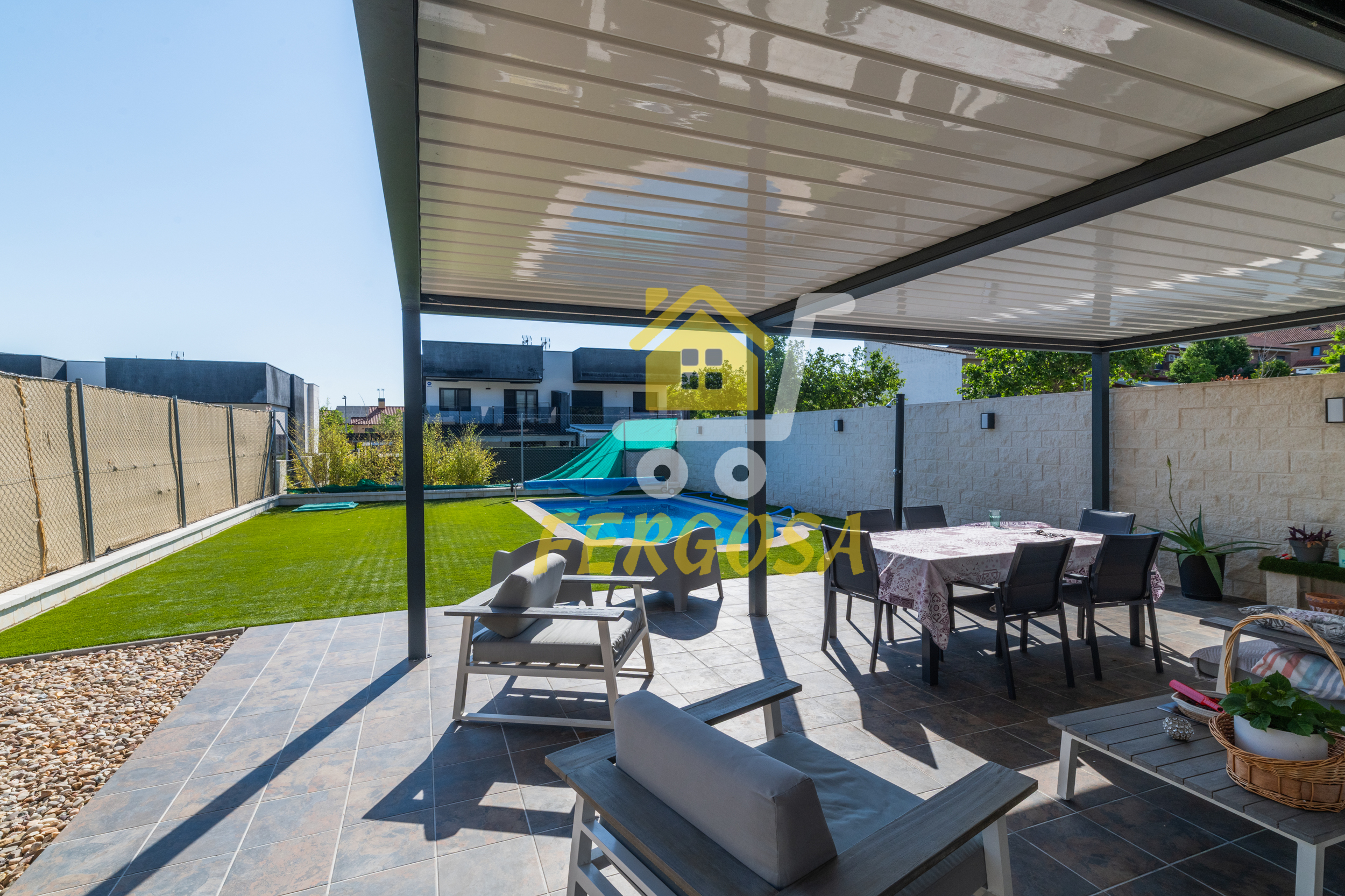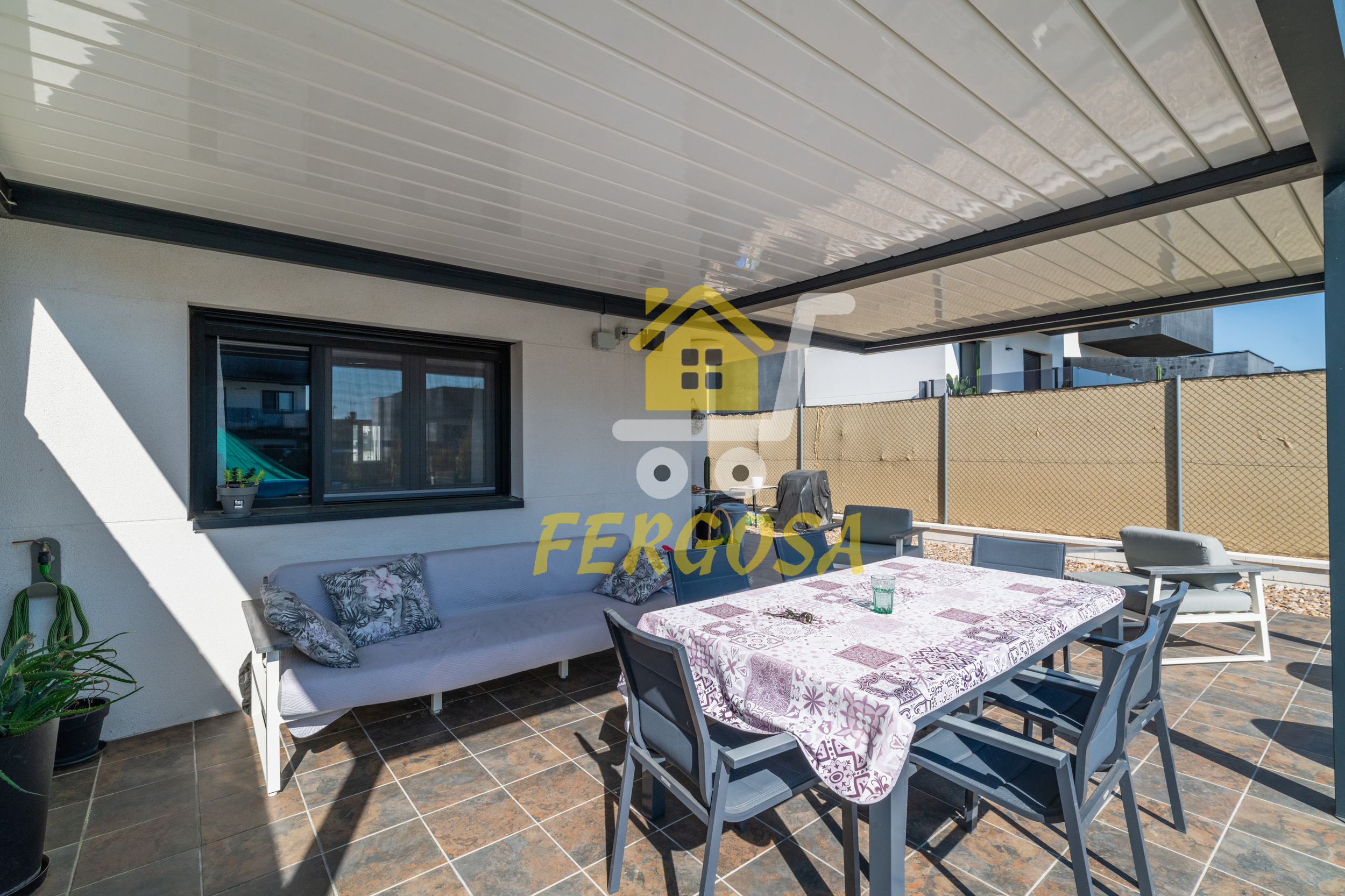 Al entrar en la vivienda nos recibe una zona ajardinada cuidadosamente diseñada, en el lado derecho nada mas entrar tenemos la zona de parking de vehículos, si seguimos el sendero de baldosas nos recibe una leñera y subiendo unos peldaños nos encontramos con la entrada a la vivienda. Al fondo nos encontramos con una fantástica piscina de agua salada para el disfrute de toda la familia sin tener que echar de menos el mar, también tenemos un solárium bioclimático que hará que el sol no sea un impedimento para tus días de piscina.
