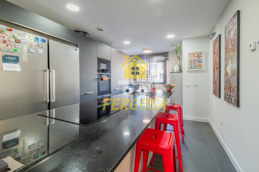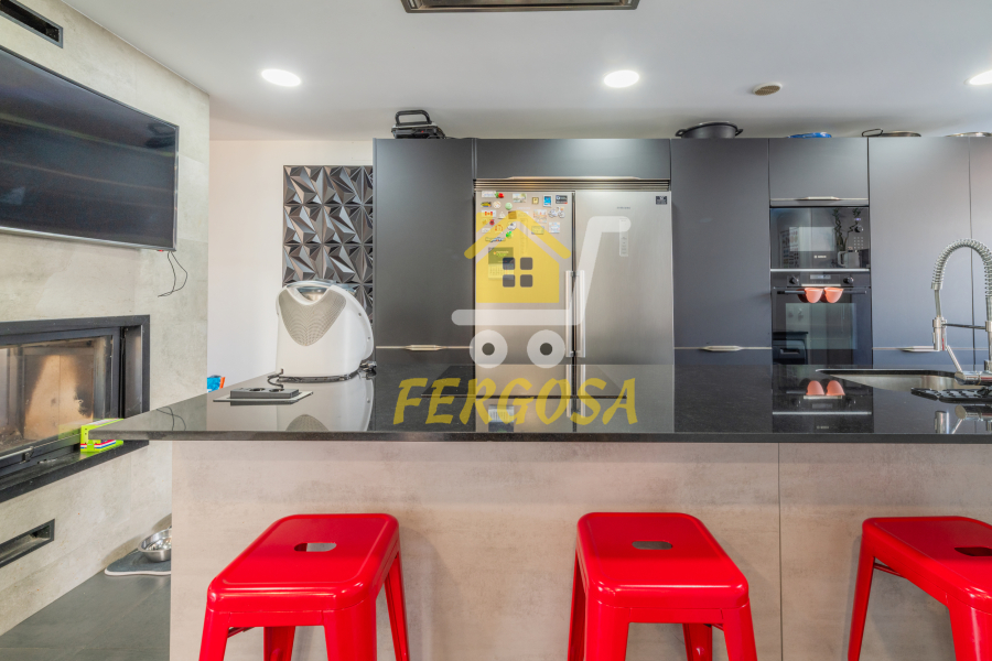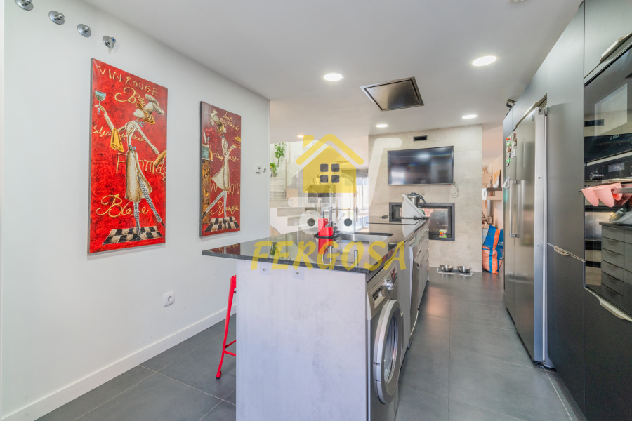 Ya una vez entramos en la vivienda nos encontramos con una magnifica cocina amplia tipo americana con una magnifica isla central con todo lujo de detalles, los electrodomésticos son de alta gama para que puedas explotar al máximo tus dotes culinarias, de ahí pasamos a un aseo con ventana biselada perfectamente cuidado al detalle una vez salimos del aseo de frente nos recibe una escalera con peldaños en mármol que te lleva a las diferentes estancias de las tres plantas de esta magnífica vivienda.