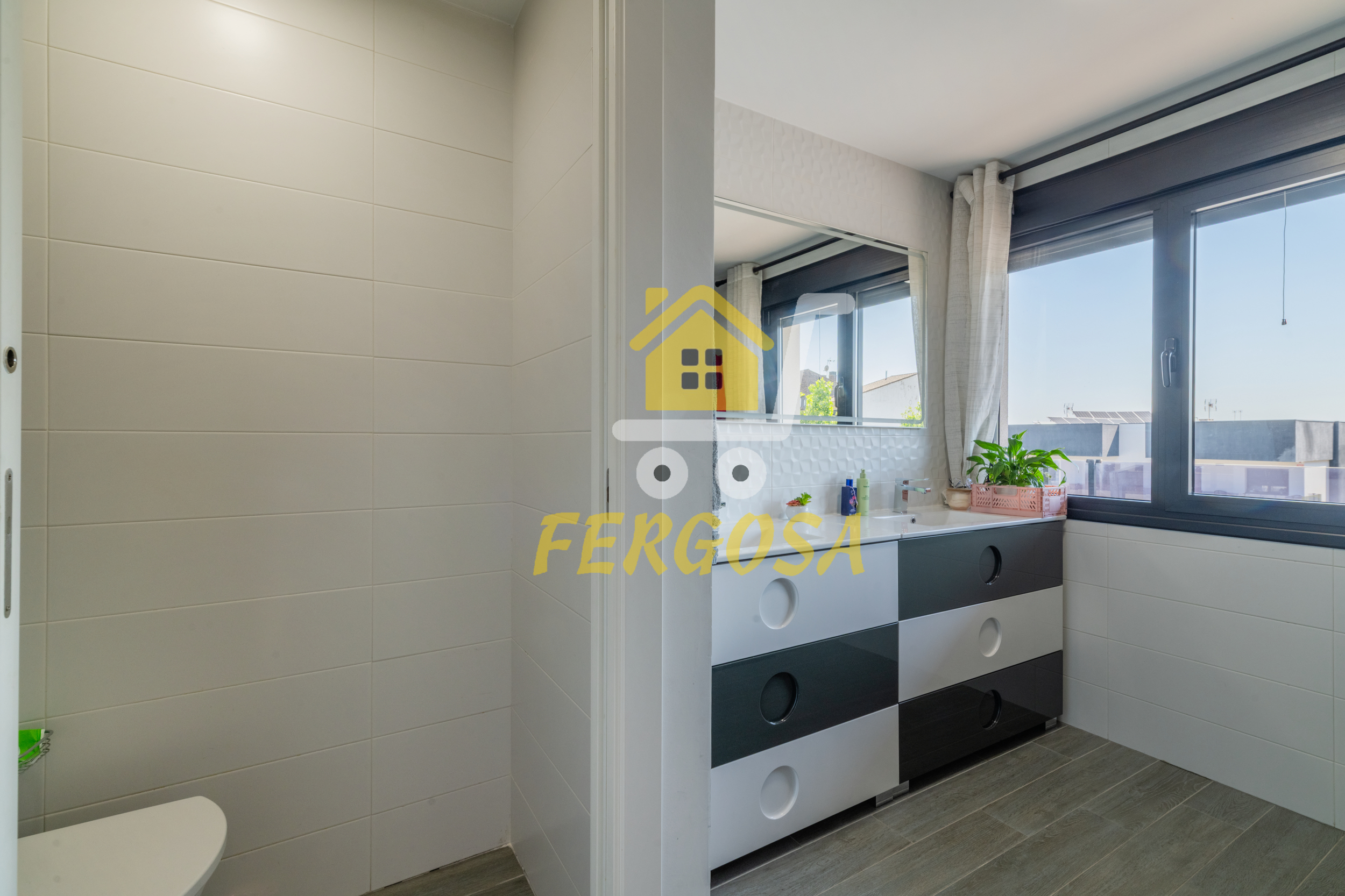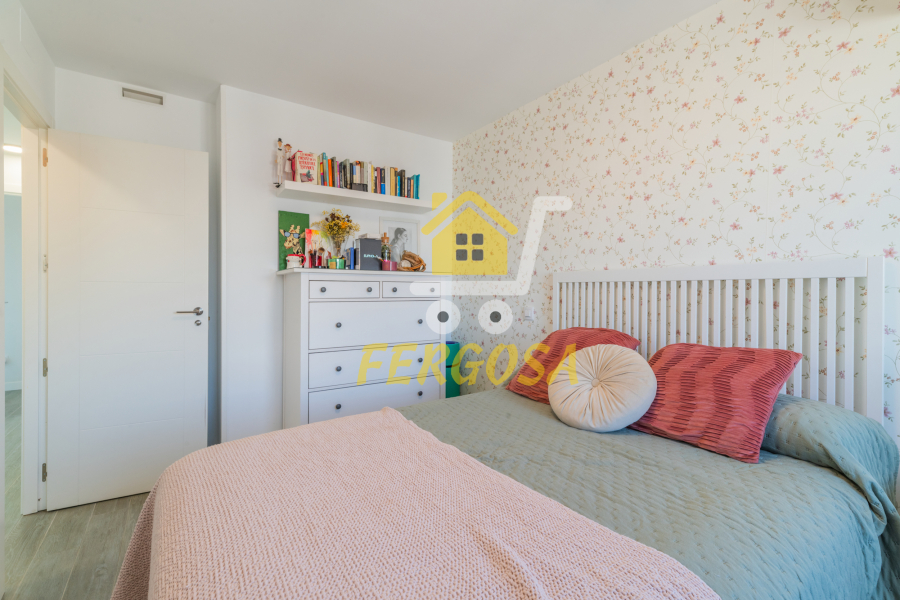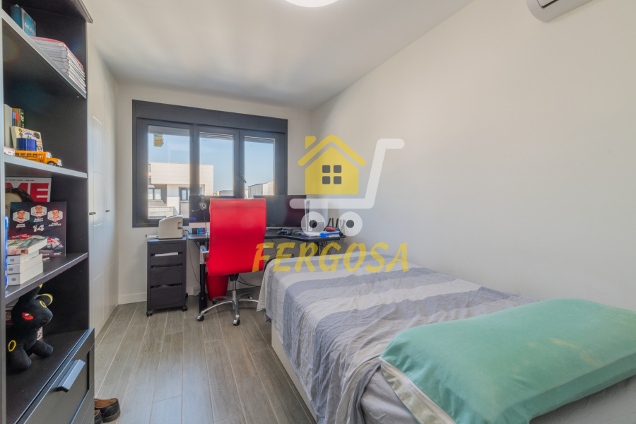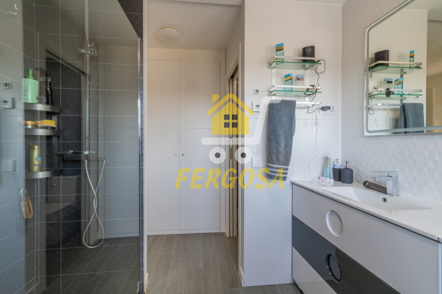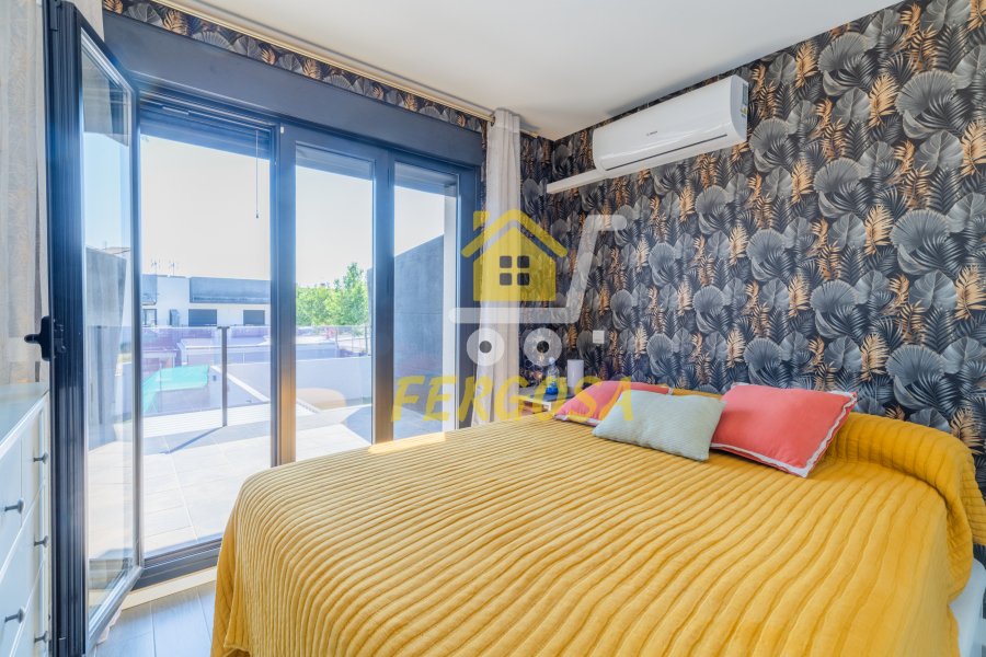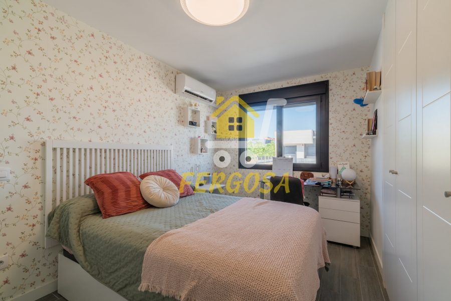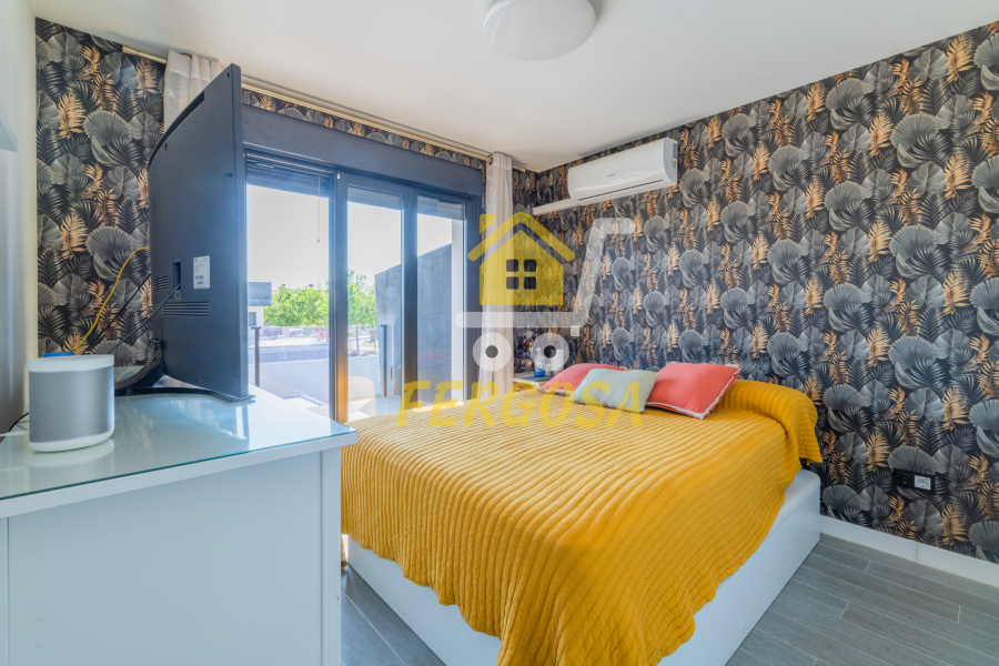 Por el lado derecho tenemos dos amplias habitaciones para los más jóvenes de la casa y un baño completo con plato de ducha amplio y zona diferenciada de wc y ducha y una vez salimos del baño a la derecha nos recibe la habitación de matrimonio con unas ventanas visión y una terraza que deja ver la piscina de la vivienda, esta suite dispone al igual que el resto de la vivienda de persianas eléctricas y mosquiteras, el baño de la suite al igual que el anterior baño divide la zona de wc de la zona de baño, también destacar que todas las habitaciones disponen de armarios empotrados bien decorados y espaciosos y ahora nos vamos a la zona de ocio de la vivienda en la planta baja.
