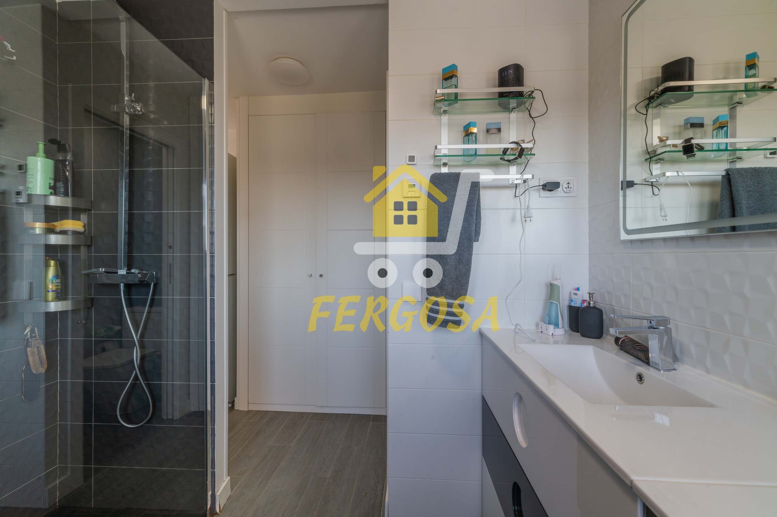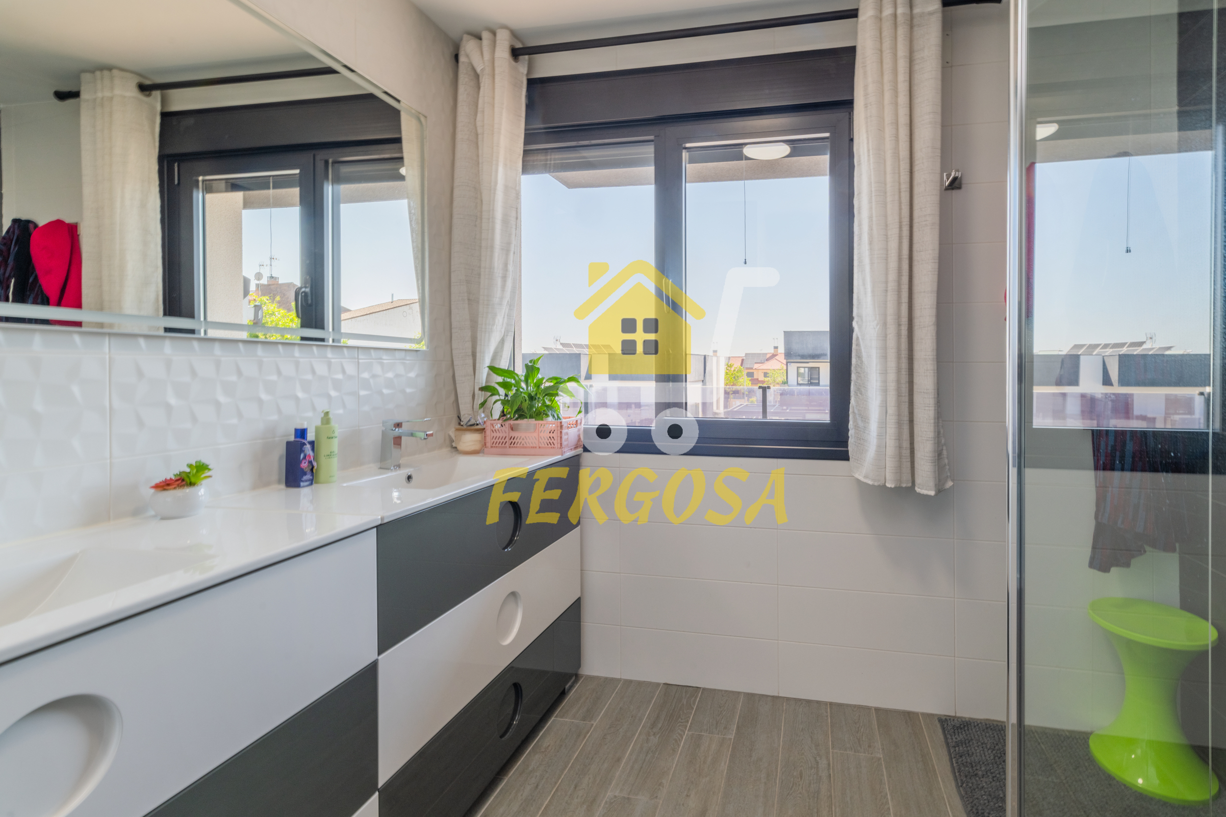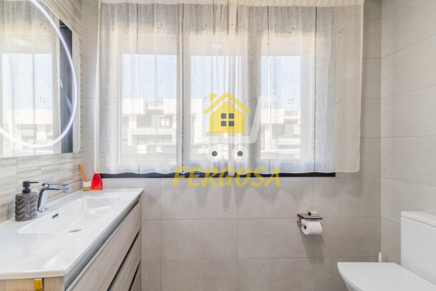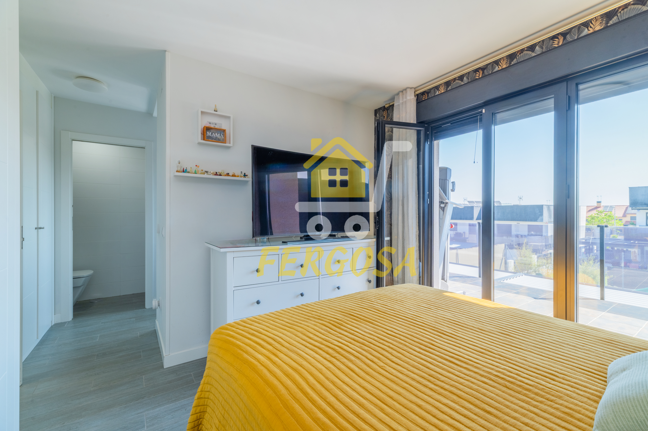 Por el lado derecho tenemos dos amplias habitaciones para los más jóvenes de la casa y un baño completo con plato de ducha amplio y zona diferenciada de wc y ducha y una vez salimos del baño a la derecha nos recibe la habitación de matrimonio con unas ventanas visión y una terraza que deja ver la piscina de la vivienda, esta suite dispone al igual que el resto de la vivienda de persianas eléctricas y mosquiteras, el baño de la suite al igual que el anterior baño divide la zona de wc de la zona de baño, también destacar que todas las habitaciones disponen de armarios empotrados bien decorados y espaciosos y ahora nos vamos a la zona de ocio de la vivienda en la planta baja.