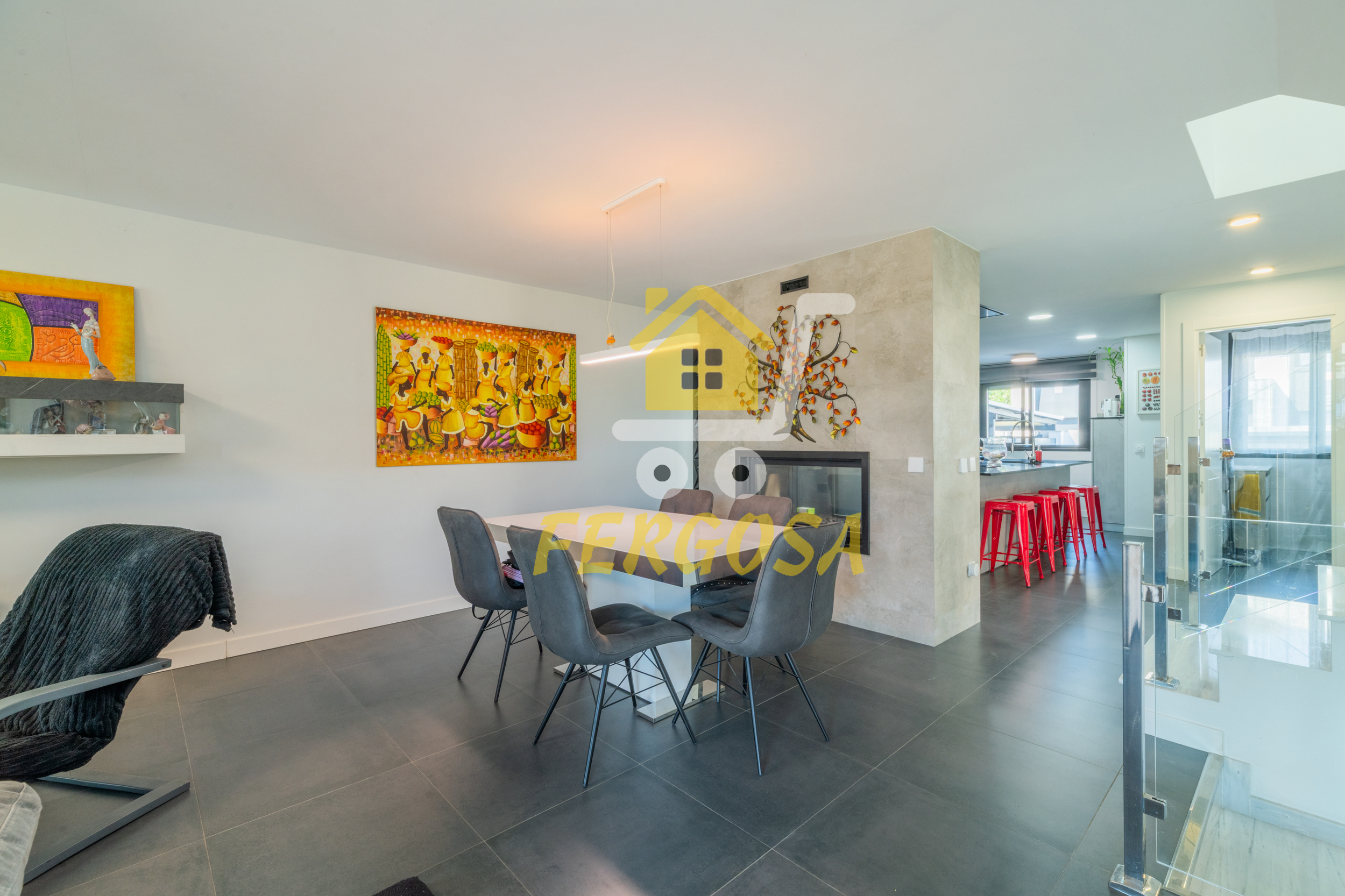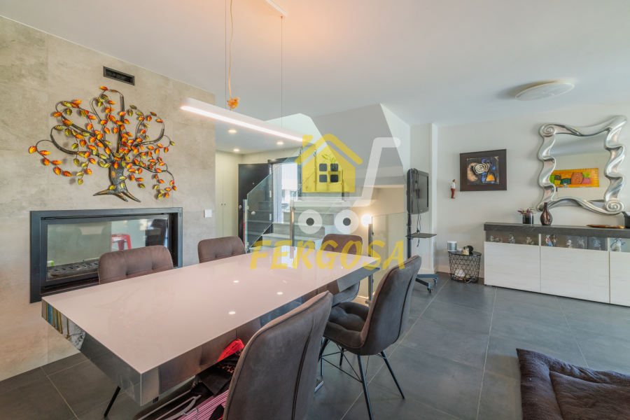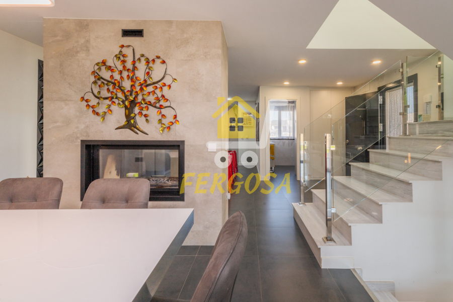Seguimos y nos recibe una estupenda chimenea y un amplio salón con unas ventanas tipo visión de gran calidad para un aislamiento perfecto de la vivienda, el suelo de esta planta es un delicado gres color gris que combina perfecto con el estilo de la vivienda, volvemos a la escalera de mármol para subir a la zona de habitaciones.